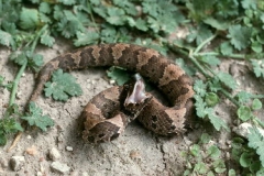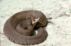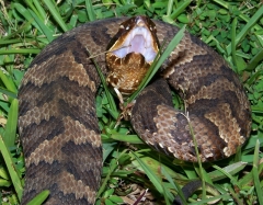 Cottonmouths do not require water to live. They spend more time out of the water (sitting on a log, coiled on a bank, or lying on a limb) than in it, but they hang out in wetlands because that is where most of their preferred food lives. Unlike many snakes that have a rather restricted diet, cottonmouths will eat almost anything. This might sound odd, but it has given them the versatility needed to be quite successful under virtually all conditions they encounter. They are known to eat fish, turtles, birds, eggs, mammals, frogs, tadpoles, carrion of all types, lizards, salamanders, and other snakes, including other cottonmouths. During a drought some years back, biologists were monitoring faunal changes in a swamp near Lafayette. As the water disappeared, species dependent on it vanished, either following the receding water or dying. When the swamp was completely dry, the only snakes to be found were cottonmouths. They were content to function as terrestrial vipers and were found to be feeding primarily on mice and other cottonmouths. When the rains returned, they expanded their diets.