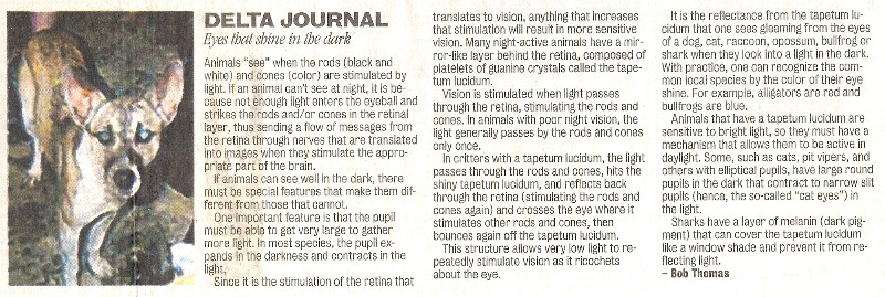 Saturday, August 4, 2007 - 20:00 Article Title Tapetum Lucidum, Delta Journal, The Times-Picayune, August 5, 2007, C-9 Mammals Delta Journal by Bob Thomas