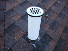 7. The best commercial product I found that appears to be squirrel-proof is the Critter Quitter vent shield (Avalon Manufacturing, LLC, www.squirrelventshield.com). This pipe is effective, attractive, and highly functional. They cost about $35 each, plus installation cost. If you are installing a new roof, that cost is negligible; if you are not, the avoided cost of roof damage from leakage is worth the price.