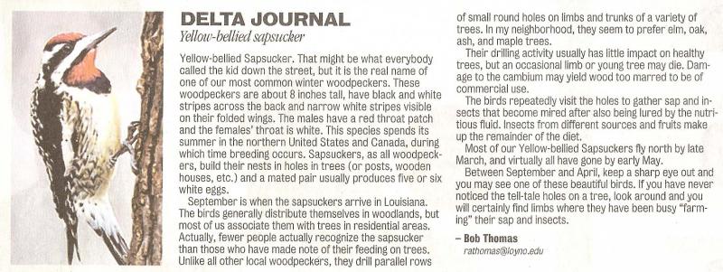 September marks the arrival of the sapsuckers in Louisiana. The birds generally distribute themselves in woodlands, but most of us associate them with trees in residential areas. Actually, fewer people actually recognize the sapsucker than those who have made note of their feeding on trees. Unlike all other local woodpeckers, they drill parallel rows of small round holes on limbs and trunks of a variety of trees. In my neighborhood, they seem to prefer elm, oak, ash, and maple trees.